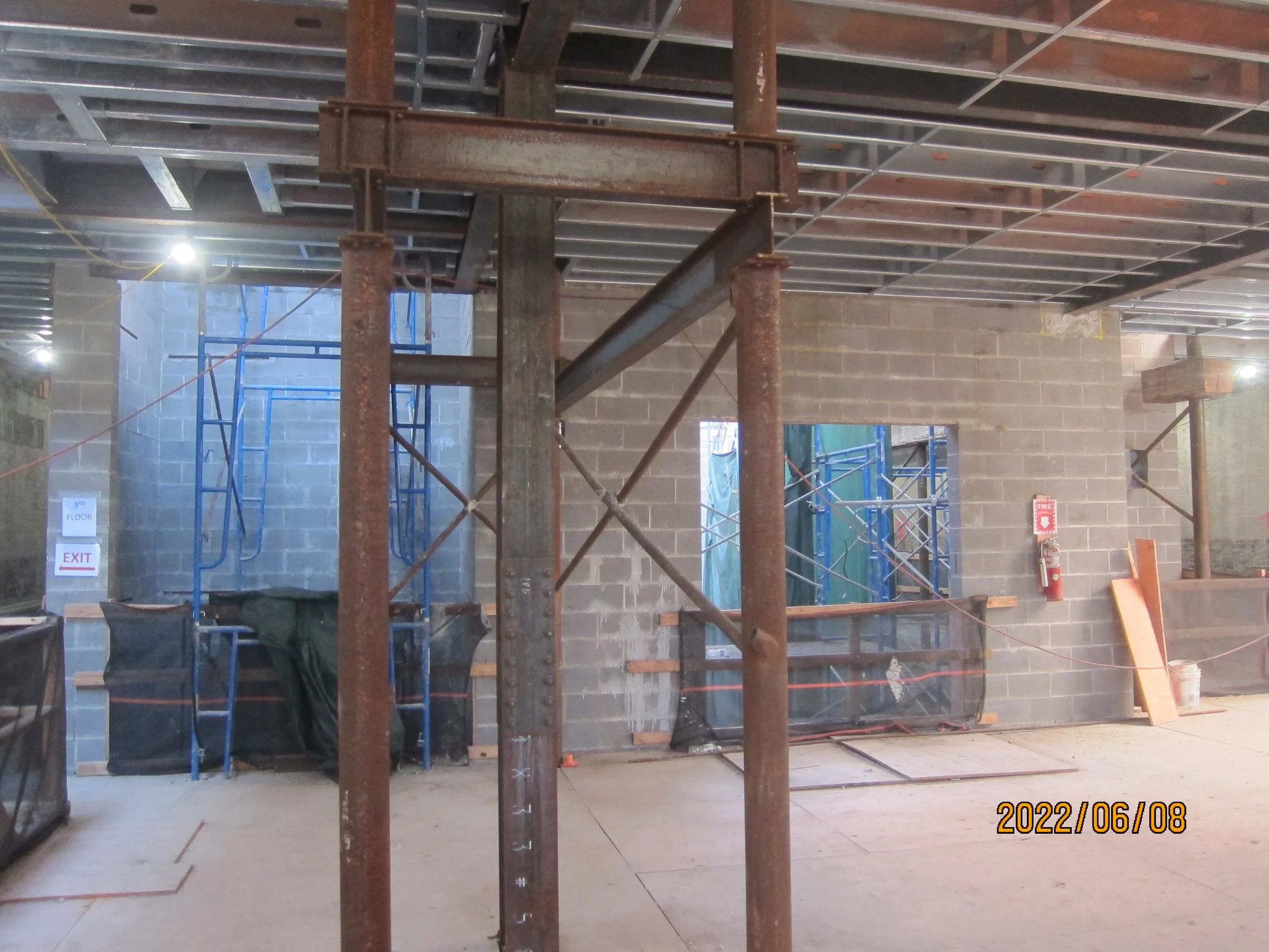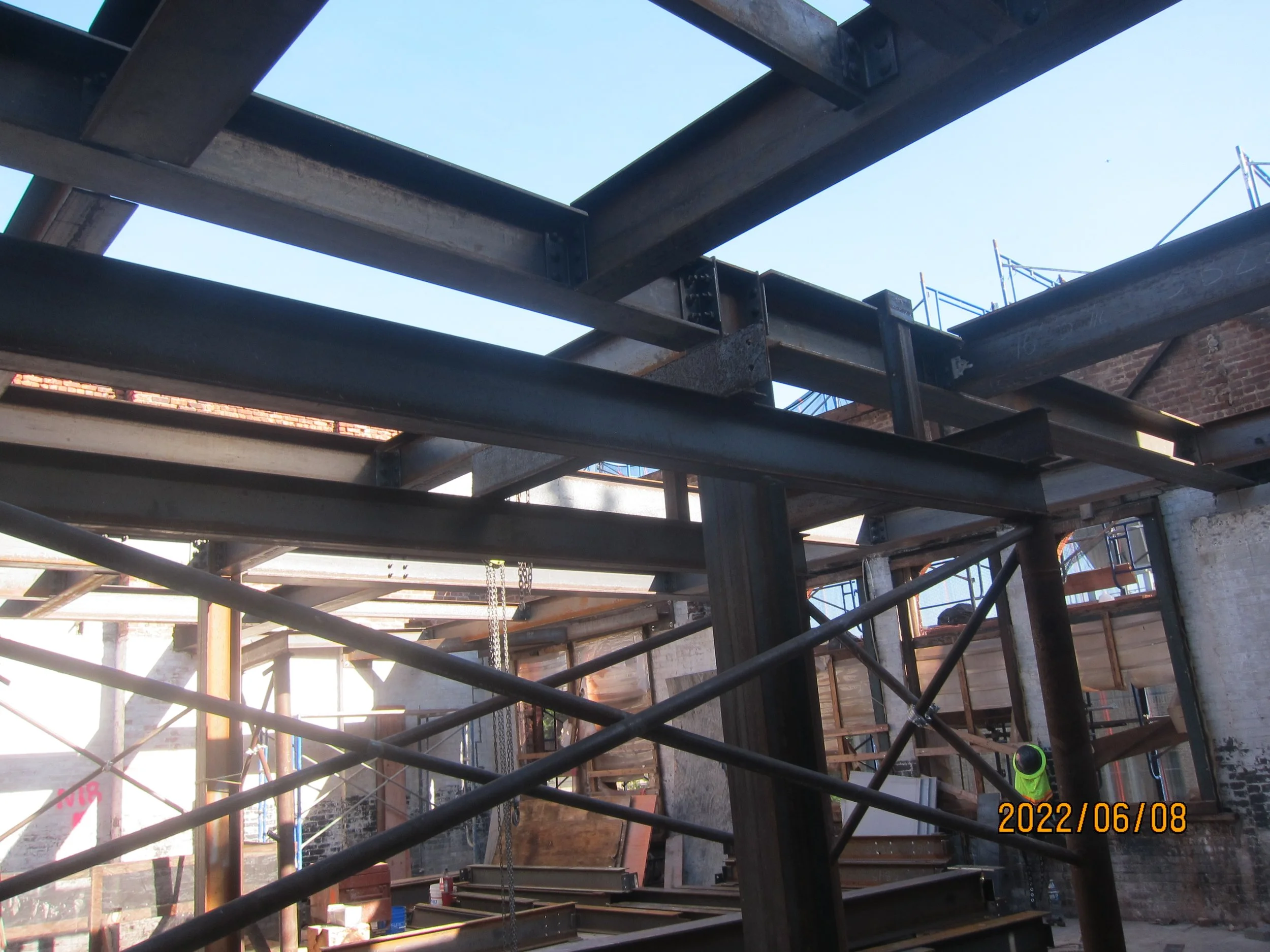 With these premises, for the adaptive use as residential building and to comply with the building code regulations of light and air for dwelling units, the existing heavy timber floor structure was replaced with new cementitious board on light gauge joist floors supported by the exterior walls, limited steel beams and columns and CMU walls around a new internal courtyard. The courtyard provides the required clearances for the apartment windows and at the cellar level it becomes a communal space for tenants, in the floors above a catalyst for possible interaction between neighbors. Three new floors were built above the existing roof level, with light gauge joist floors supported by light gauge bearing/shear walls. A portion of the existing foundation was reused and new piles were drilled for the new structure.